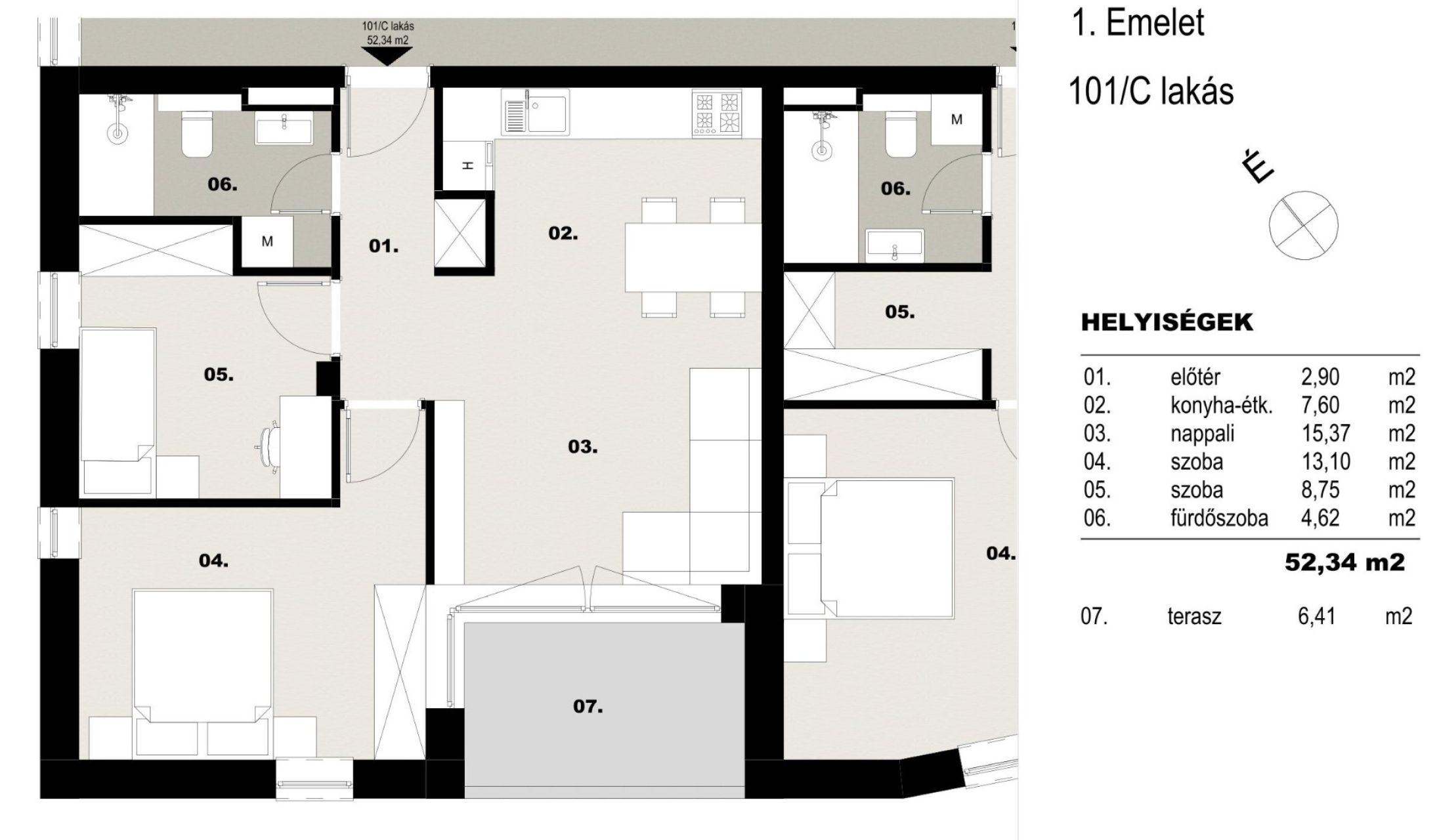 A lakásban két tágas szoba mellett egy napfényes nappali, amerikai konyha, valamint egy jól felszerelt fürdőszoba kapott helyet. A nappaliból közvetlenül kiléphetünk a kellemes méretű teraszra, amely tökéletes helyszínt biztosít a reggeli kávézásokhoz vagy esti pihenésekhez.