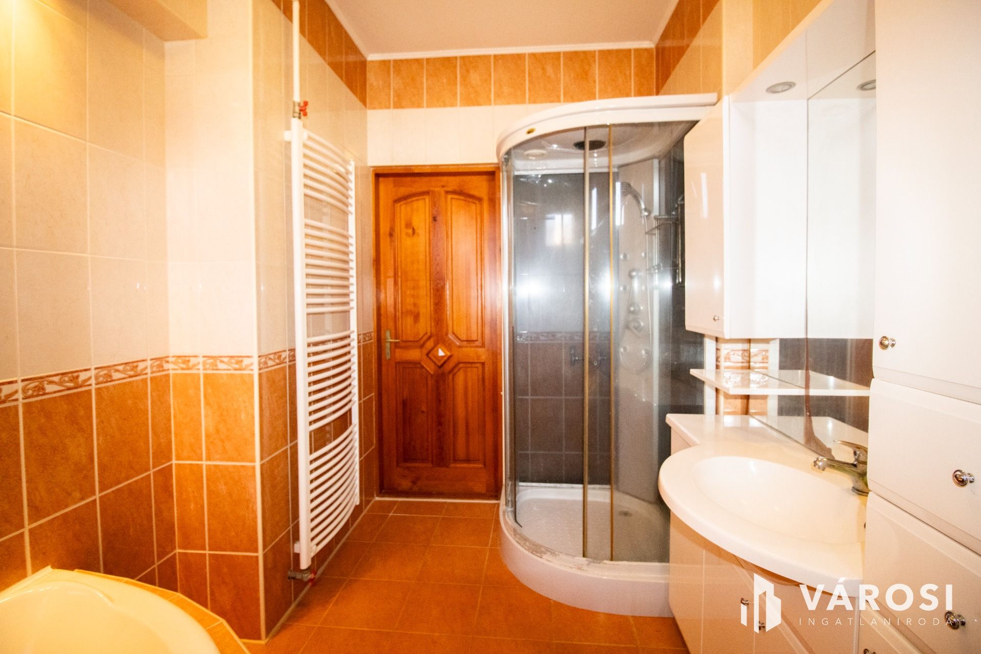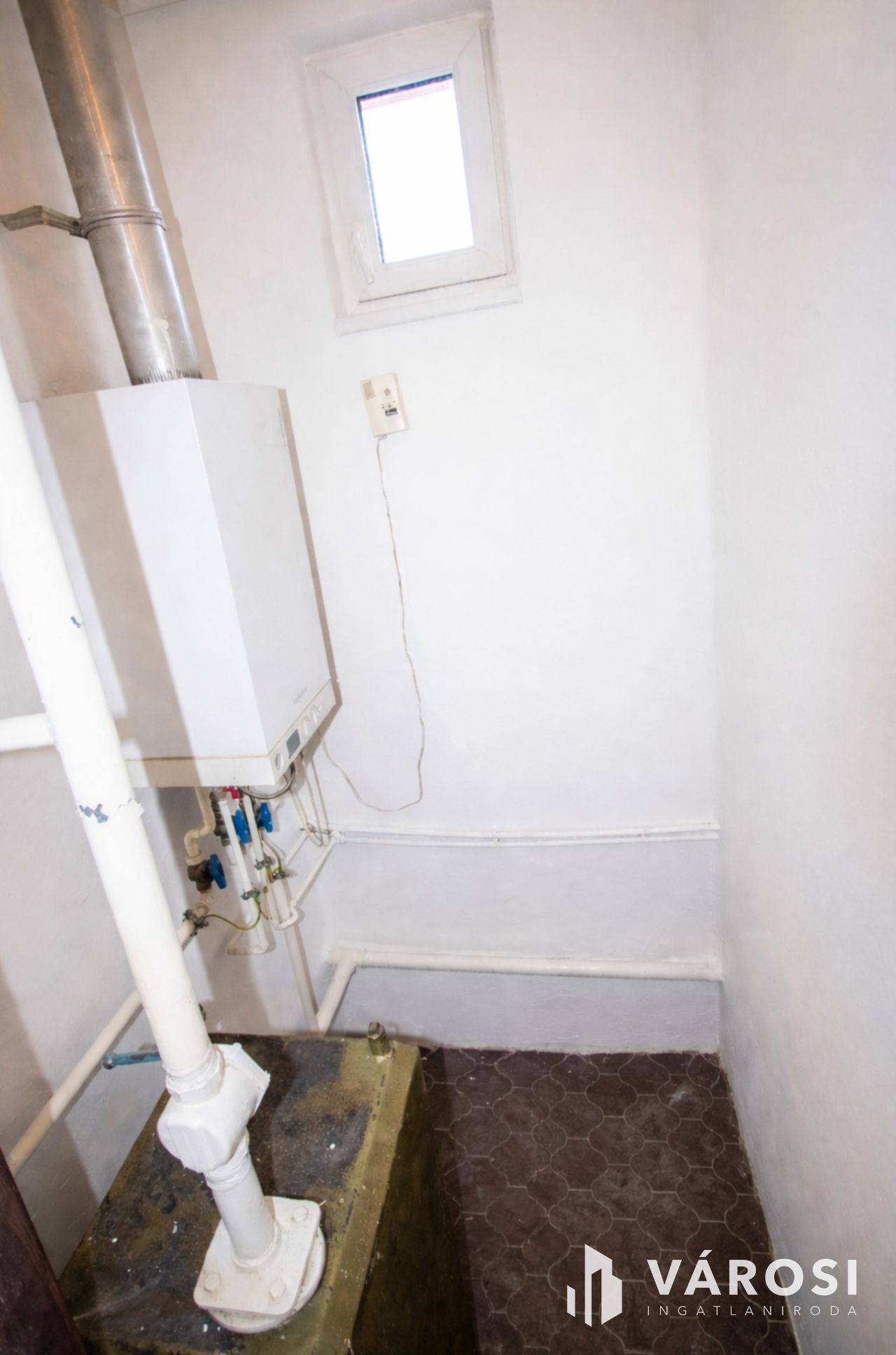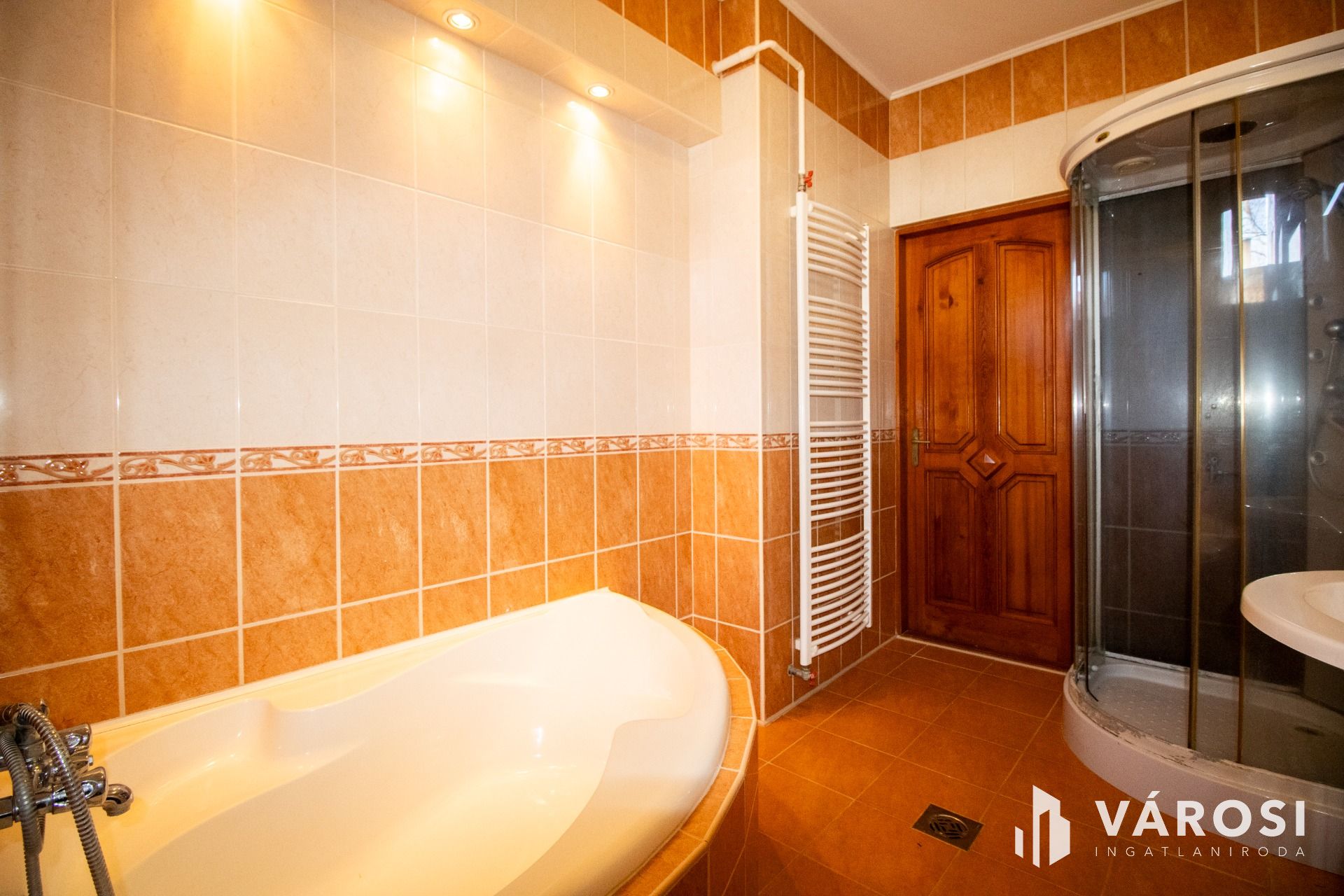A fürdőszoba kádas és zuhanyzós kialakítású, modern burkolatokkal és spotlámpás világítással. A WC külön helyiségben található. A kazánház/háztartási helyiségben vegyes tüzelésű kazán és kombi gázkazán is működik, amelyek a fűtést és a melegvizet biztosítják.