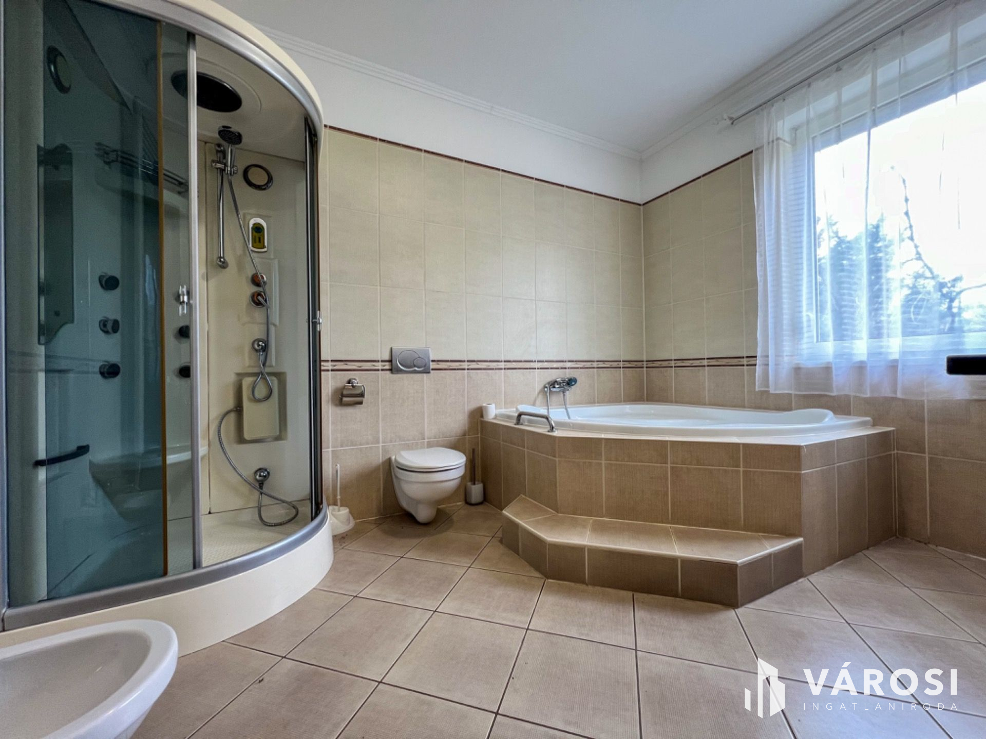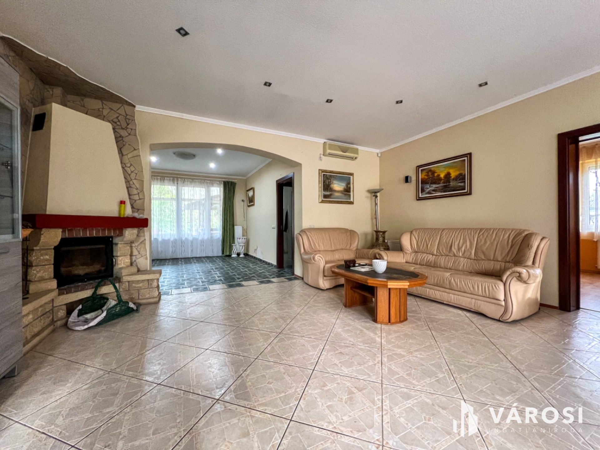 Helyiségei: 2 hálószoba, nappali, konyha+étkező, kamra, közlekedő, gardrób, mosóhelyiség, fürdőszoba, szauna, külön nyíló W.C., szélfogó, garázs, beépített terasz, nyitott terasz.