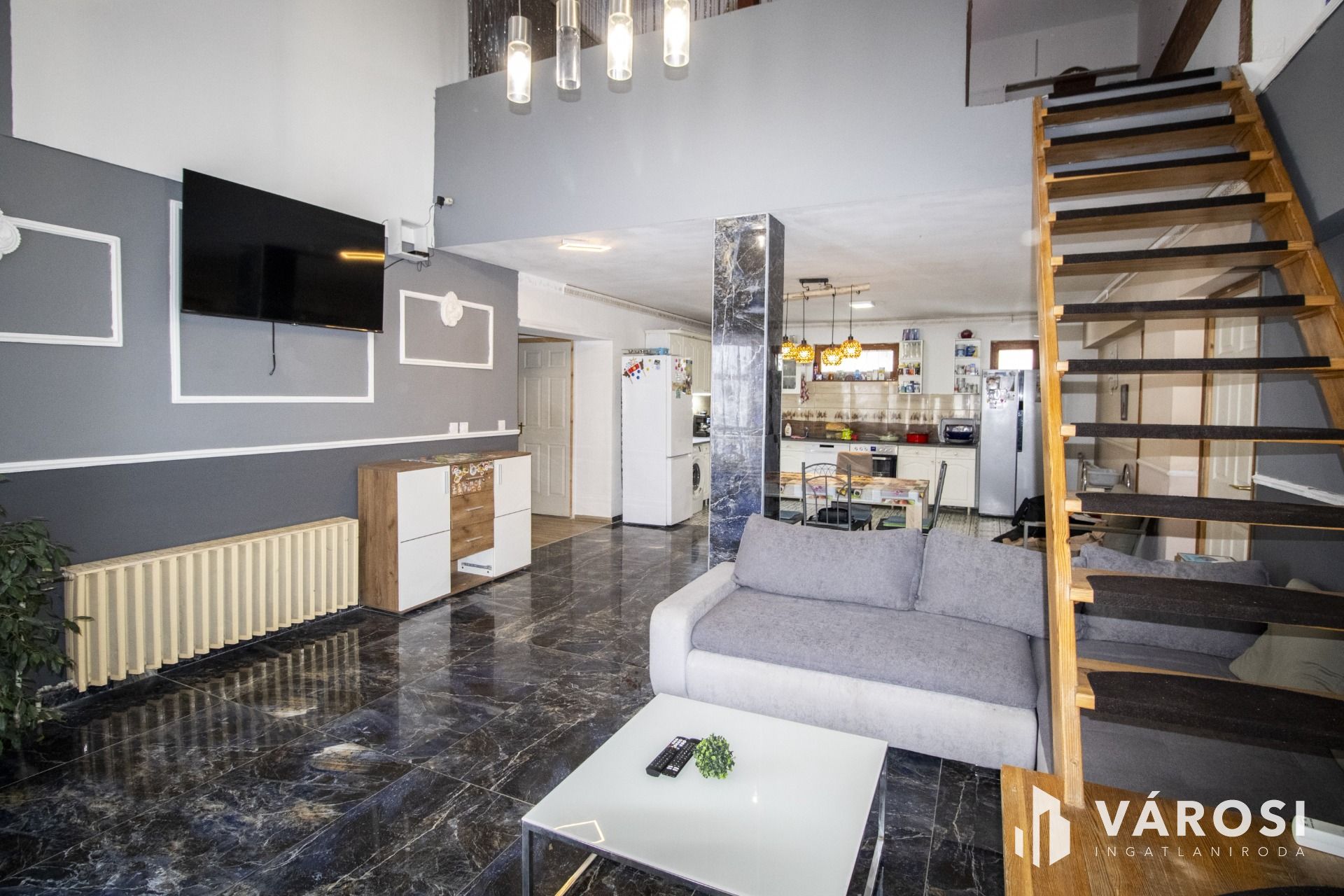 Belépve az ingatlanba egy 46 nm-es amerikai konyha–étkező–nappali tér fogad, amely azonnal magával ragad. A magas belmagasság lehetővé tette egy amerikai stílusú galéria kialakítását, ahol egy 20 nm-es szoba kapott helyet, különleges rálátással a nappalira – tökéletes gyerekszoba, dolgozósarok vagy vendégtér. A nappali, a konyha és az étkező ugyan egy légtérben helyezkednek el, mégis a minőségi burkolatok finoman tagolják a funkciókat.