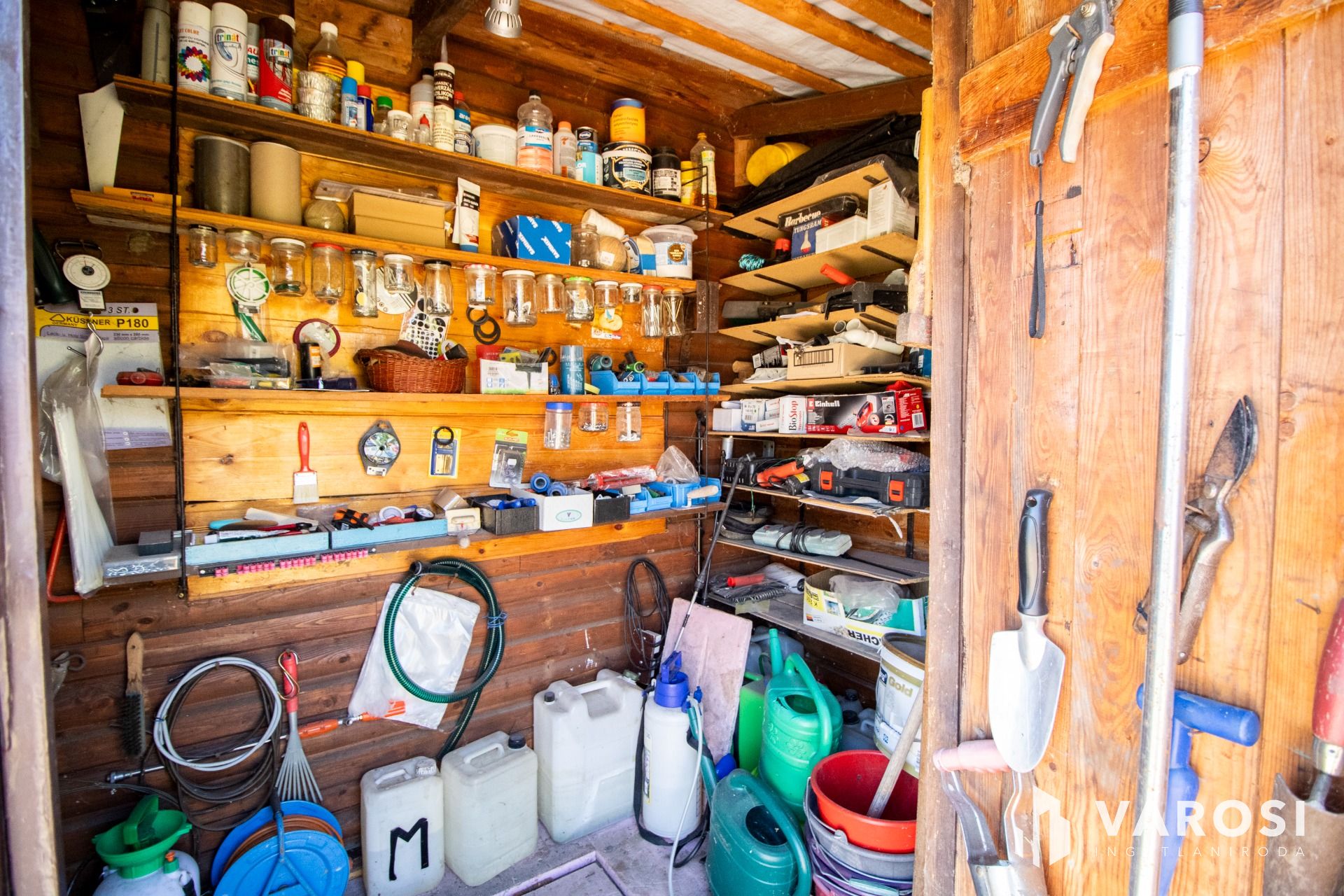A kert látványa önmagában meghatározza az ingatlan karakterét. A parkosított udvart gondosan kialakított díszfák, bokrok és rendezett zöldfelületek teszik különlegessé, amelyeket automata öntözőrendszer gondoz, fúrt kútról működtetve. A kert egyik legszebb eleme a csobogóval kialakított kerti tó, amely sajátos hangulatot ad az egész udvarnak. A pihenéshez hangulatos filagória áll rendelkezésre, miközben a fedett autóbeálló, az elektromos utcakapu és a praktikus szerszámos fészer a mindennapi használat kényelmét biztosítja. A fészer alatt pince is kialakításra került, ami további tárolási lehetőséget nyújt.