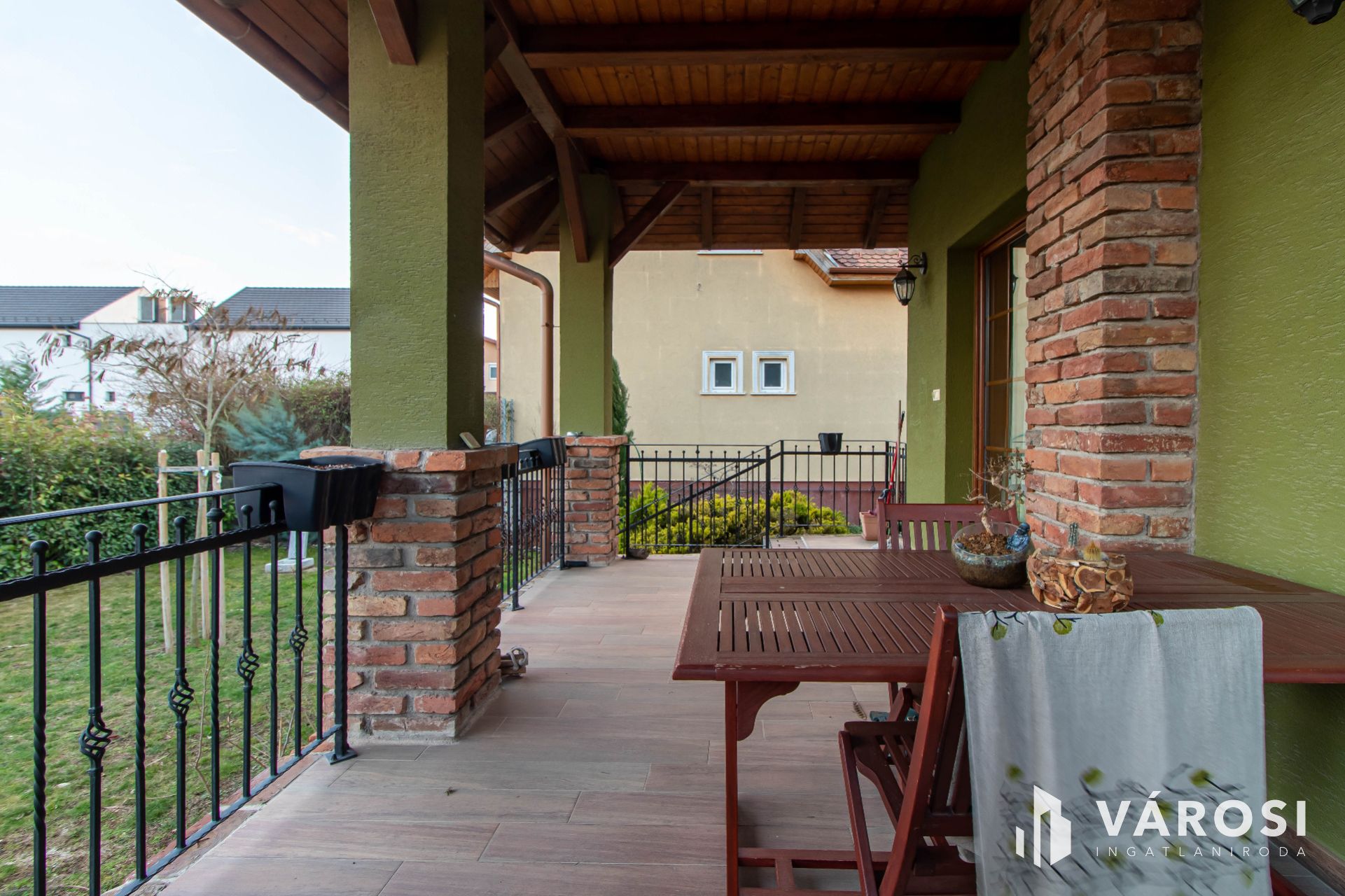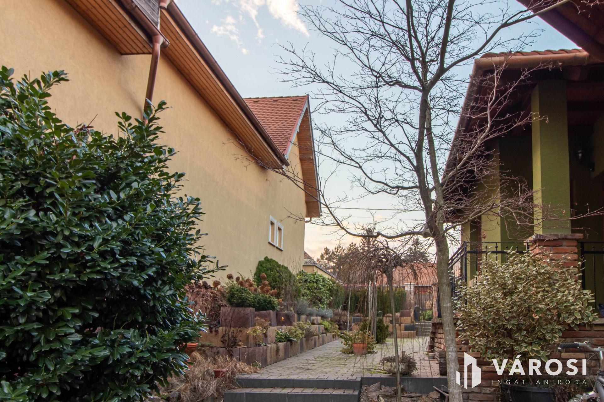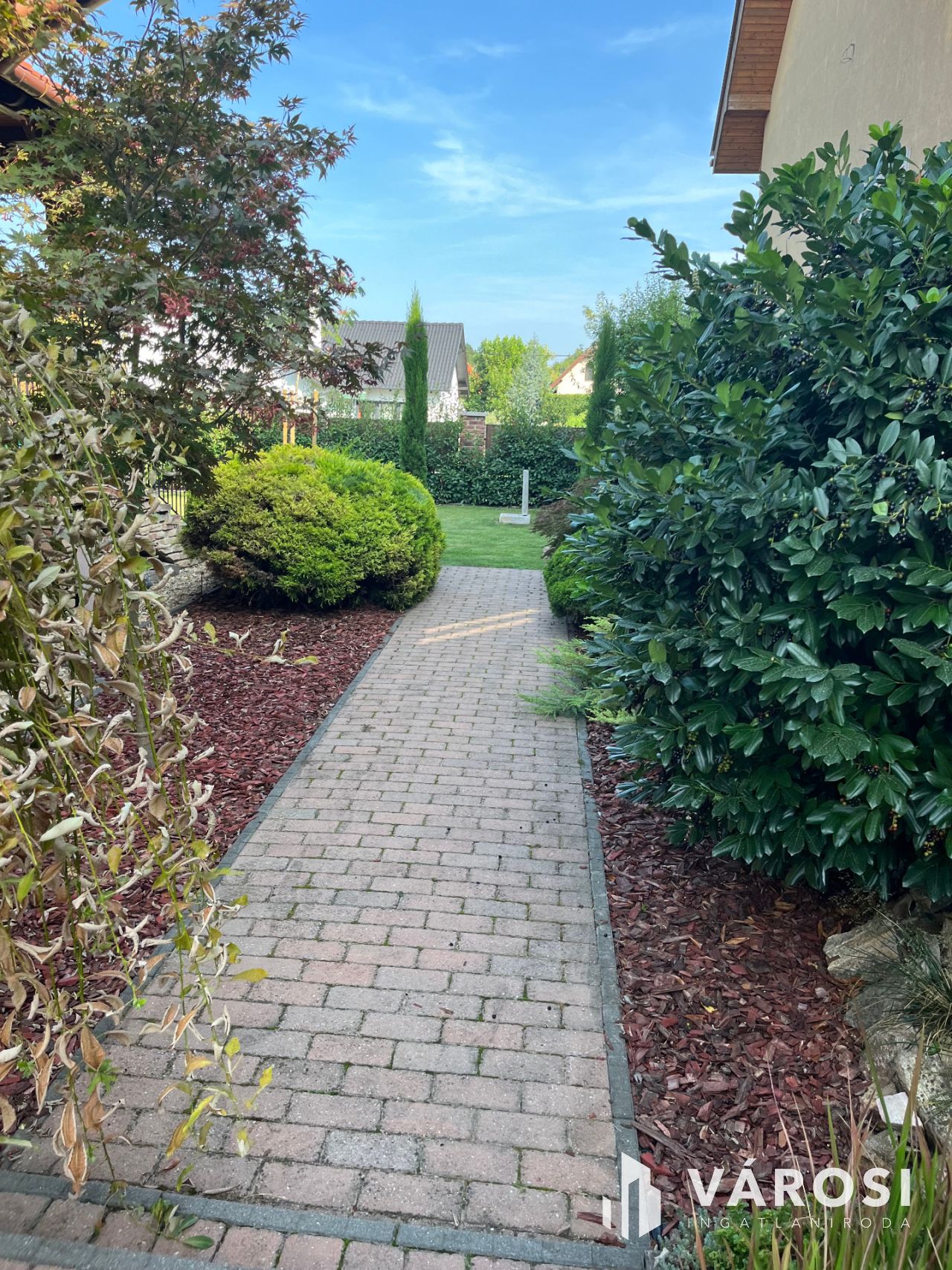 A 800 m²-es telek igazi ékkő. Az előkert rendezett, térkövezett, örökzöldekkel díszített, automata öntözőrendszerrel ápolt. A hátsó kert viszont egy valódi privát oázis: zöld gyep, külön grillező- és sütögetőhely, hangulatos szaletli — tökéletes helyszín baráti estékhez, családi ünnepekhez vagy egy csendes borozáshoz egy hosszú nap végén. A nappaliból közvetlen teraszkapcsolat nyílik erre a kertre, így a belső és külső tér szinte egybeolvad.