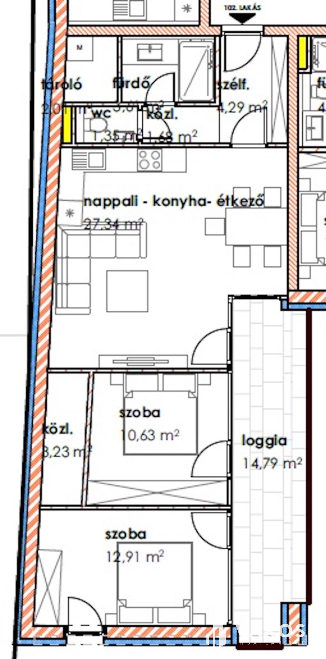 A 1 db amerikai konyhás nappalival, 1db hálószobával, 1 db fürdőszobával, közlekedővel, loggiával rendelkezik.
