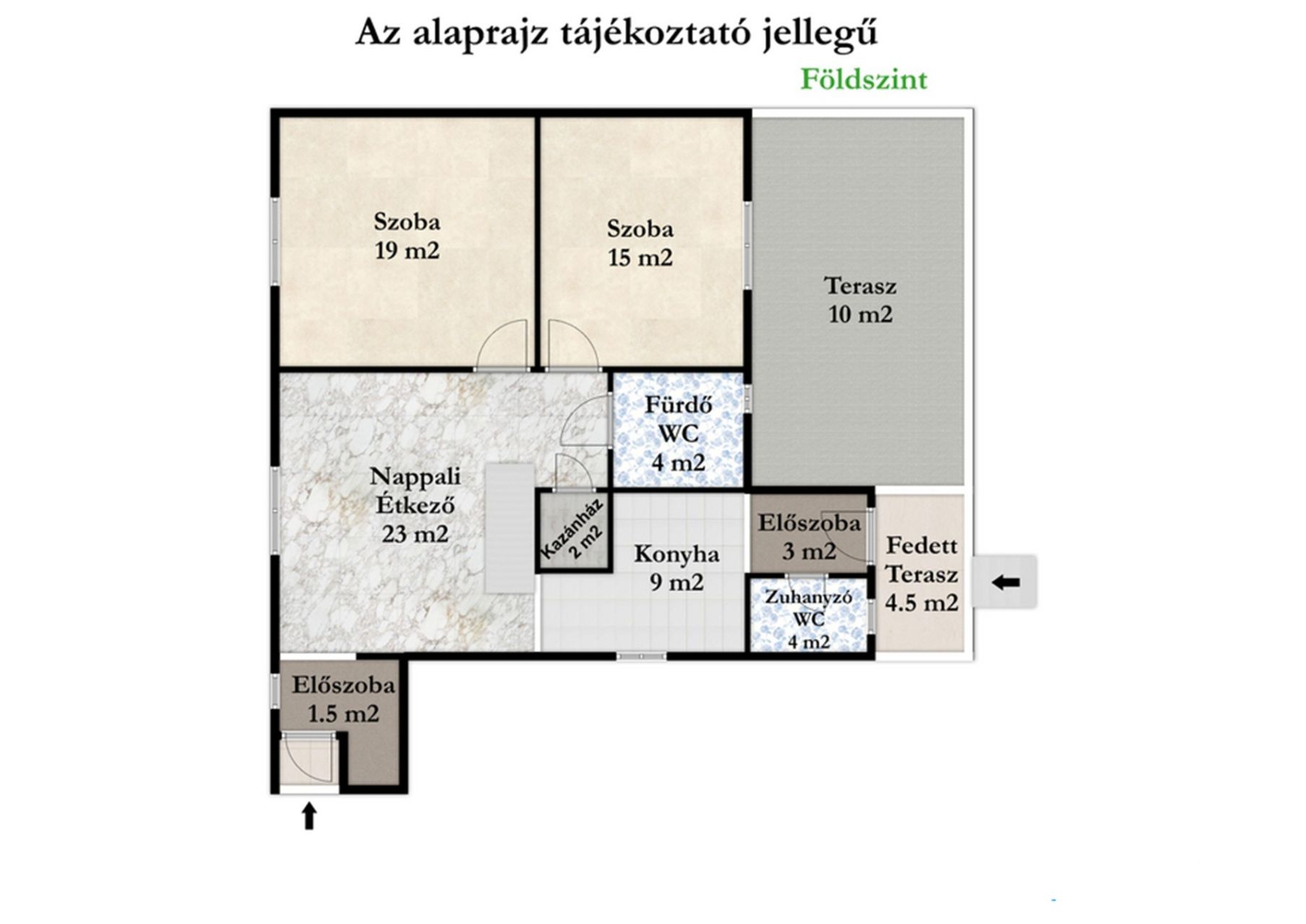 A konyhából egy háztartási helyiség nyílik, ahol a mosó- és szárítógép kapott helyet, valamint innen egy második fürdőszoba is kialakításra került WC-vel és zuhanyzóval. Ebből a helyiségből lehet kijutni a hátsó, körülbelül 15 négyzetméteres teraszra. Ennek a résznek a befejezése még hátra van, a burkolatok és az utolsó finom munkák még elkészítésre várnak.