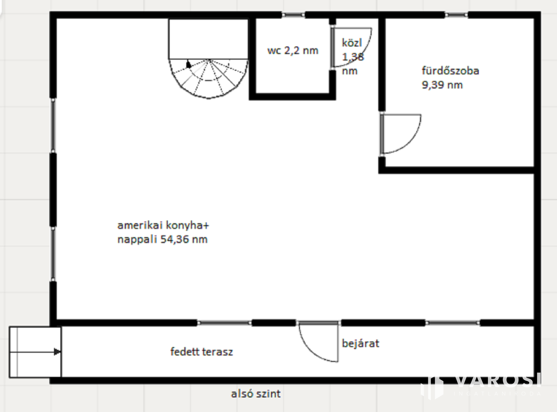 Összetétele: az alsó szinten: külön fürdőszoba és wc, közlekedő, amerikai konyhás nappali.