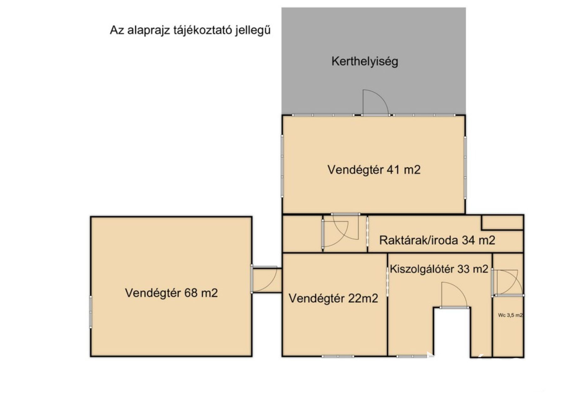 Több kiszolgáló helyiség tartozik az ingatlanhoz többek közt étel előkészítő, iroda, személyzeti mosdó, vendég mosdók tánctér, kerthelyiség.