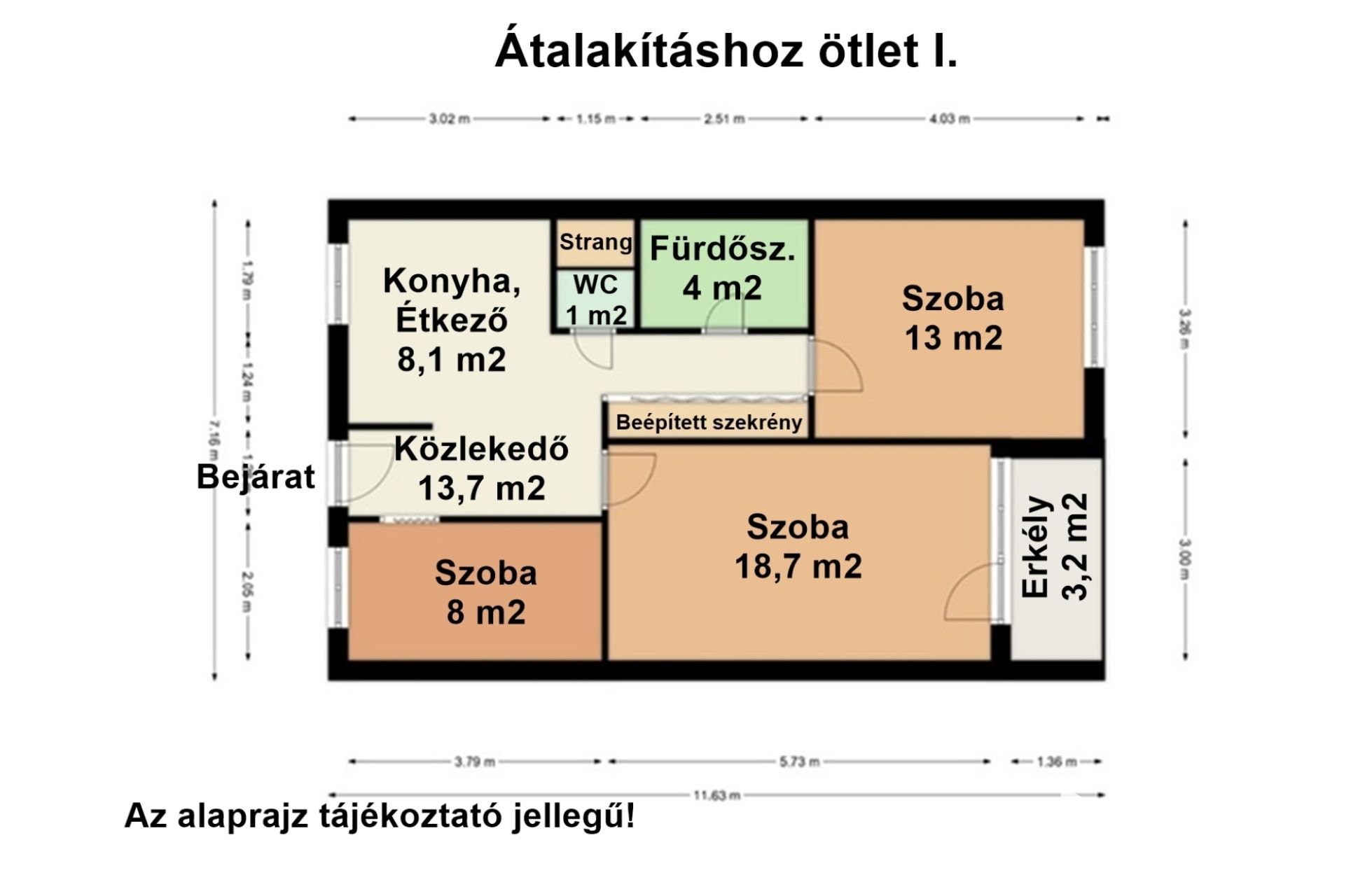 A beépített szekrények praktikus tárolási lehetőséget nyújtanak, míg a közös tároló további helyet biztosít a ritkán használt tárgyak számára.