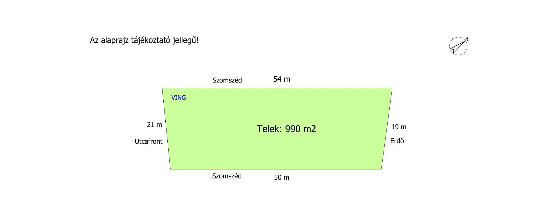 A telek szép, egyenletes, murvás útról megközelíthető, utcafront szélessége 14 méter, egy oldal kivételével körbekerített.