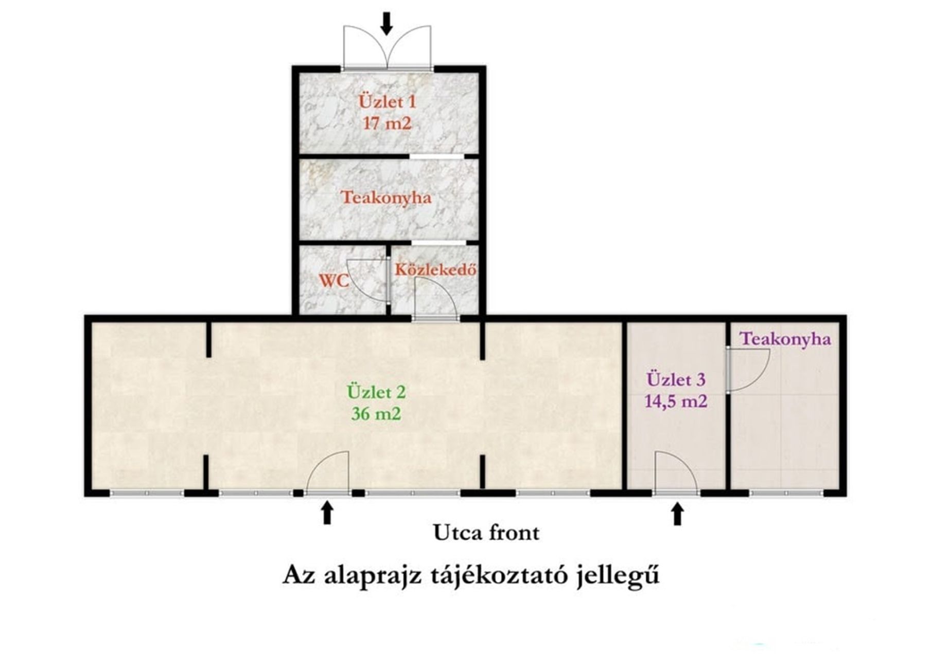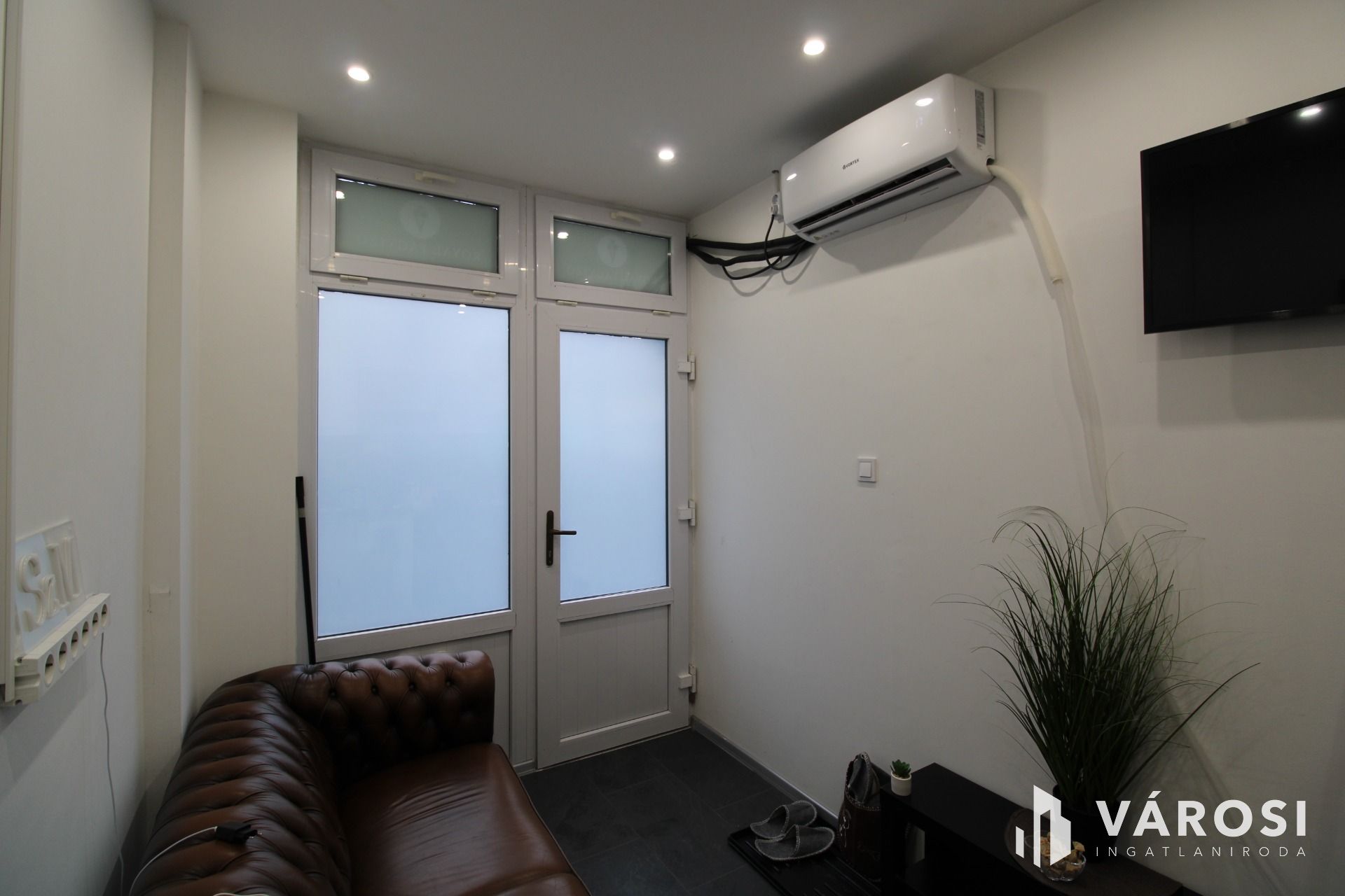 A hátsó üzlethelyiség saját vizesblokkal, teakonyhával és külön mellékhelyiséggel rendelkezik, fűtése és hűtése klímával megoldott, így önálló irodaként, szépségipari vagy egészségügyi szolgáltatásra is kiváló. A nagyobb, utcafronti üzlet tágas, egy légterű kialakítású, két vízvételi lehetőséggel, új nyílászárókkal és szintén klímás fűtéssel-hűtéssel, így gyakorlatilag bármilyen kereskedelmi vagy szolgáltató tevékenységre alkalmas. A kisebb utcai üzlet két helyiségből áll, vendégfogadó térrel és külön kezelőrésszel, amely kifejezetten kedvező például kozmetikai, egészségügyi vagy tanácsadói funkciókra. Teakonyhával rendelkezik. Klímával megoldott itt is a fűtés és hűtés.