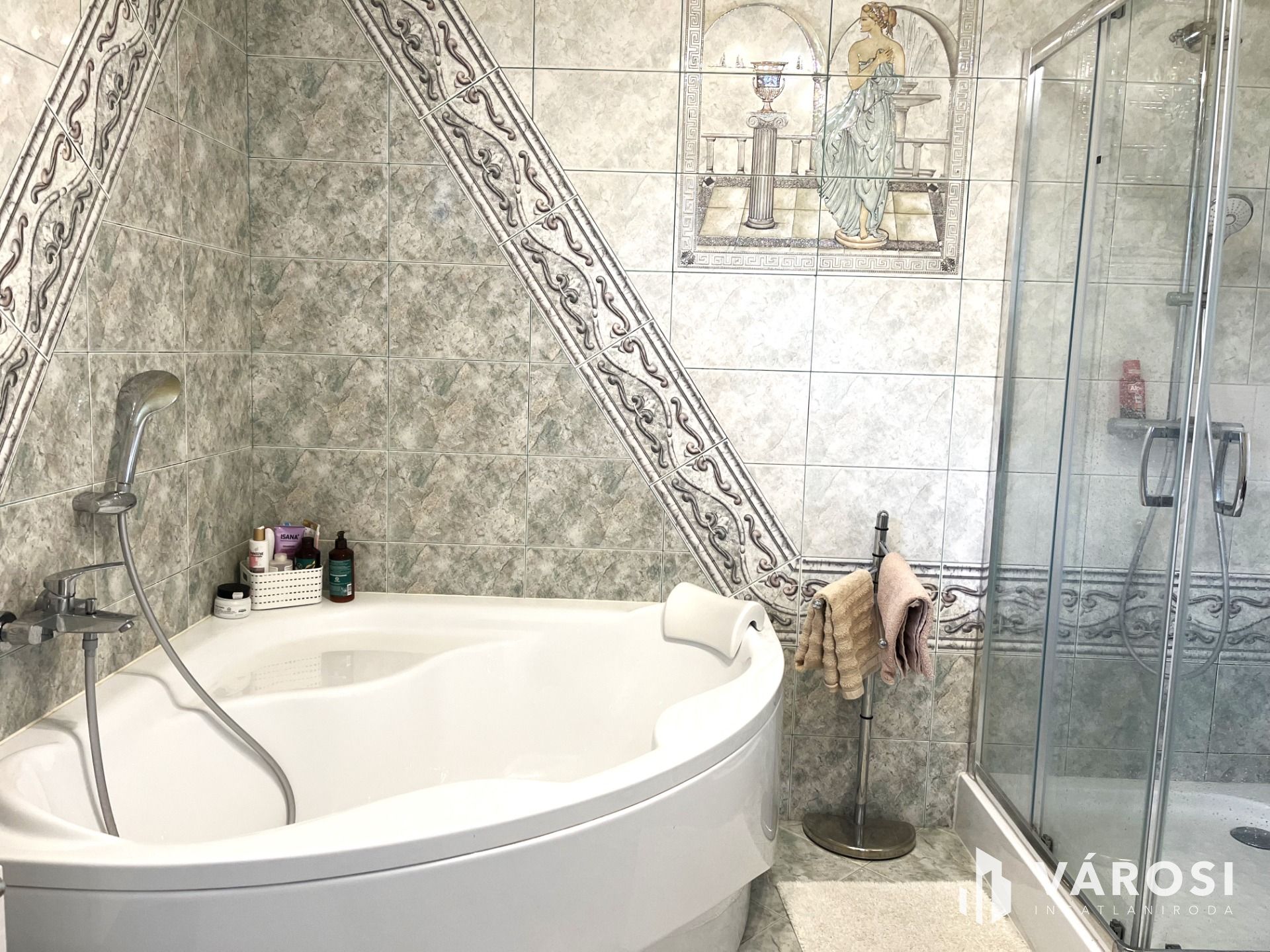 Az emeleti lakótérben az amerikai konyhába és étkezőbe érkezünk, ahol a modern, egyedi konyhabútor új elektromos berendezéseket rejt magába, az értékes antik bútorok mellett. Ezen a szinten található három világos, tágas szoba, eredeti, szép állapotú, parkettázott aljzattal. A udvar felőli szobában hangulatos, fa tüzelésű kandallót építettek be. Majd az új burkolatú közlekedőn keresztül eljutunk az igényesen felújított sarokkádas, zuhanyzós fürdőszobába és külön toalettbe.