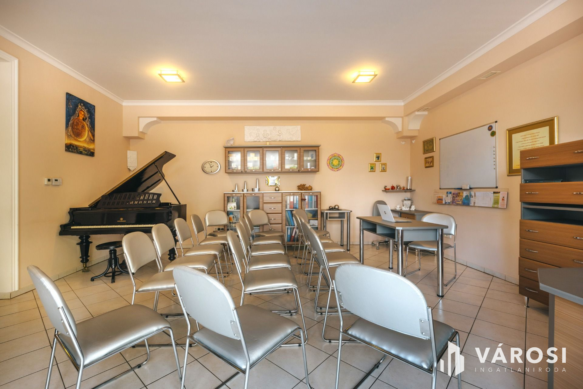 A komplexum központi helyisége a 36m2 területű bemutatóterem, amely otthont adhat 50 fős előadásoknak, rendezvényeknek.