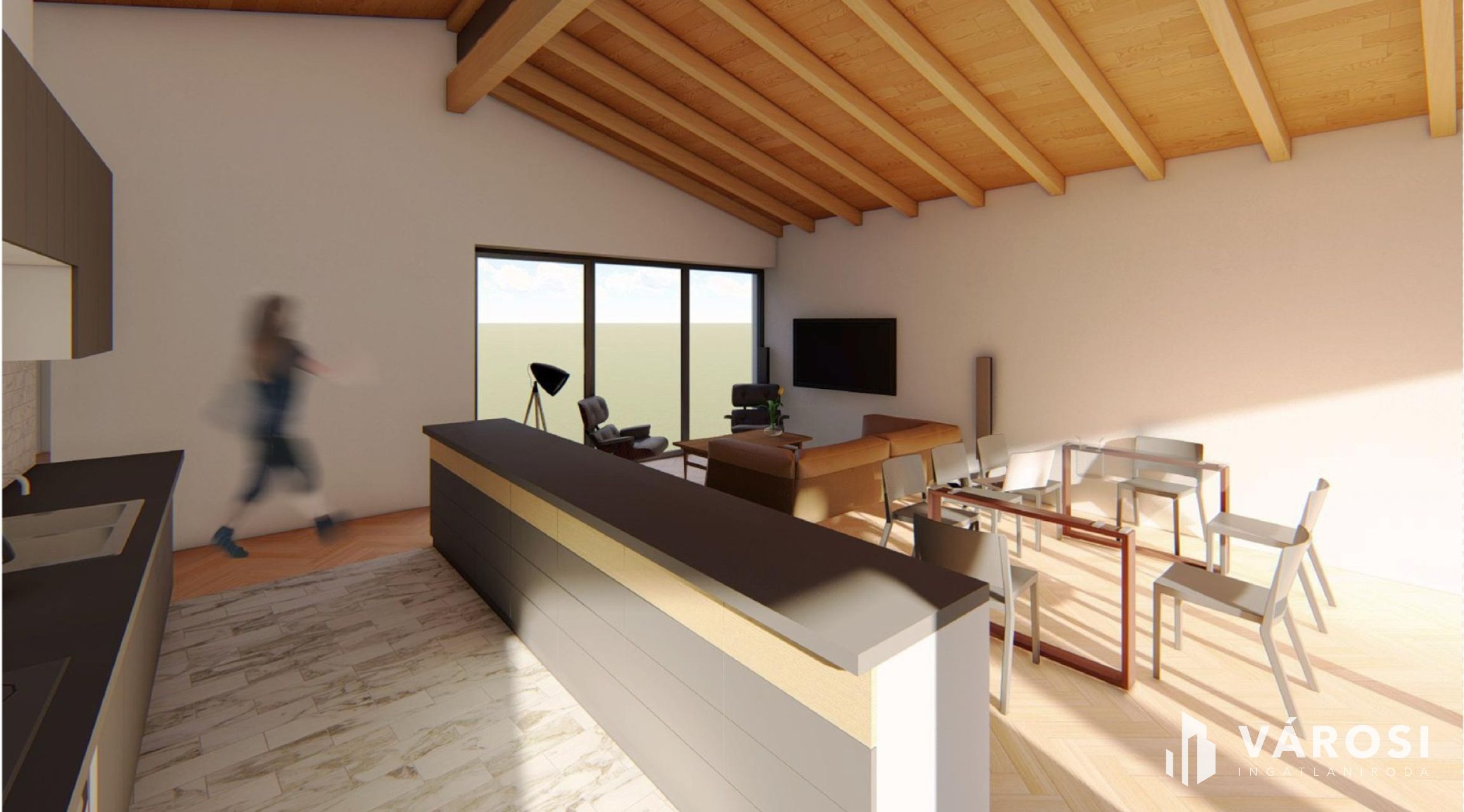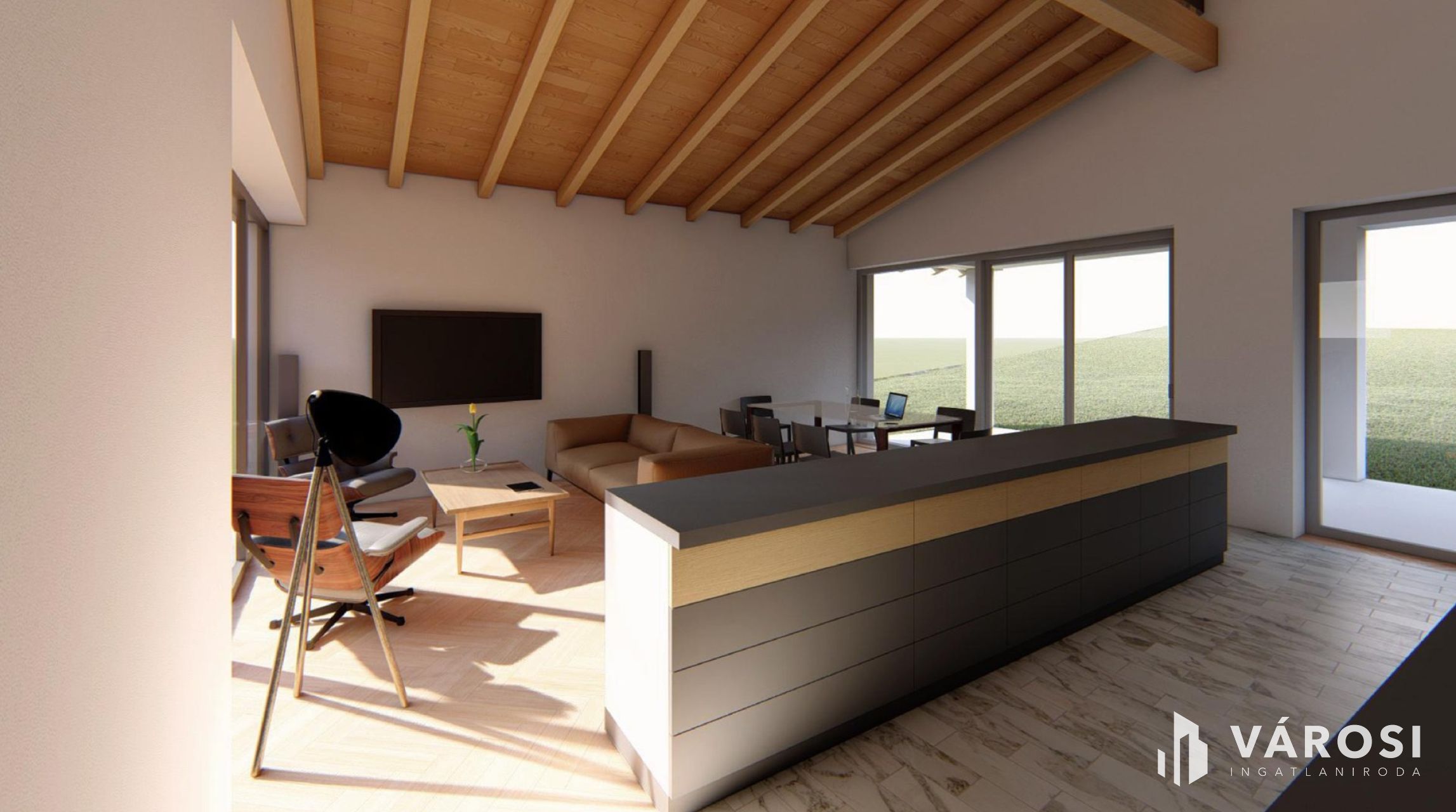 Felső szint: amerikai konyhás étkezős nappali, három hálószoba, egy fürdő, egy háztartási helyiség, valamint egy külön mellékhelység. A nappaliból egy 32 m²-es teraszra léphetünk ki.