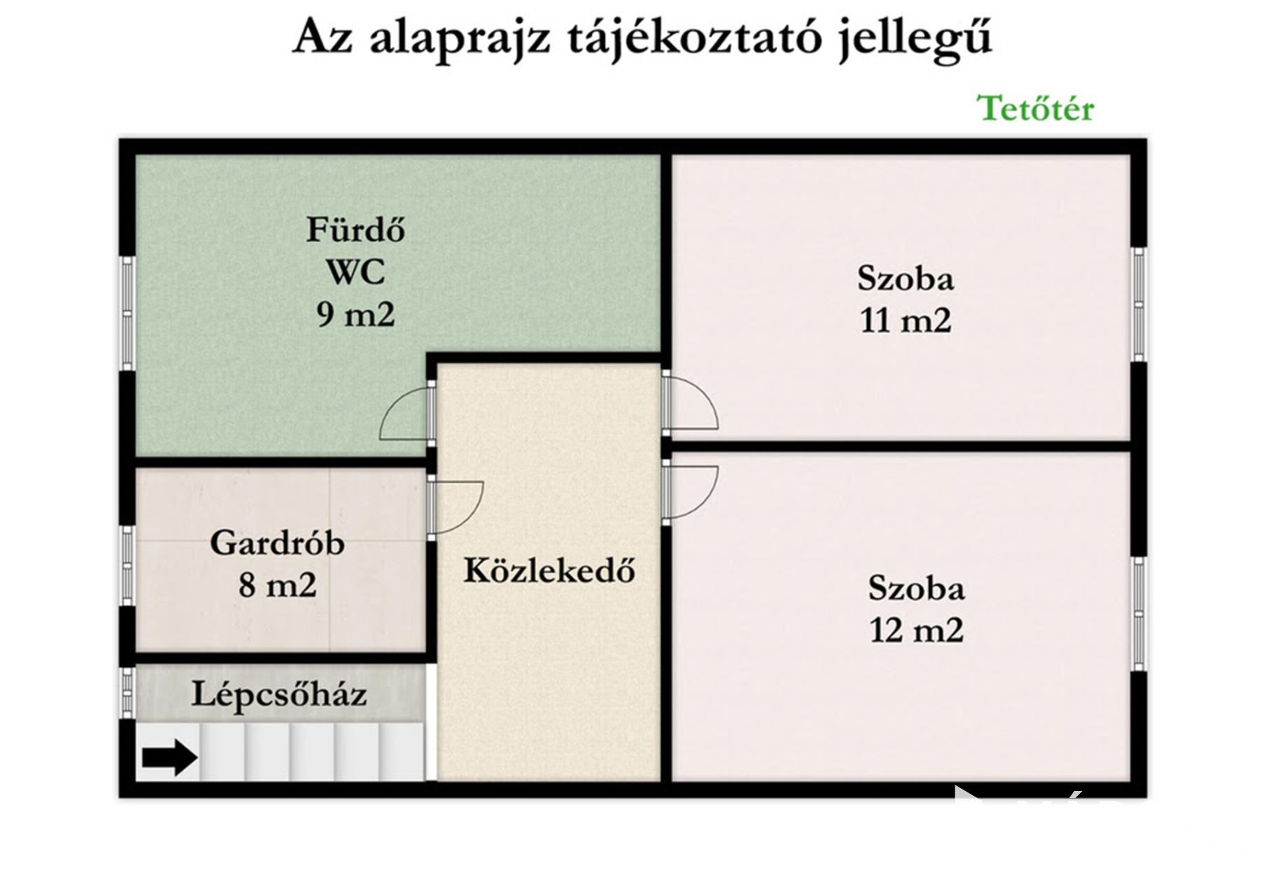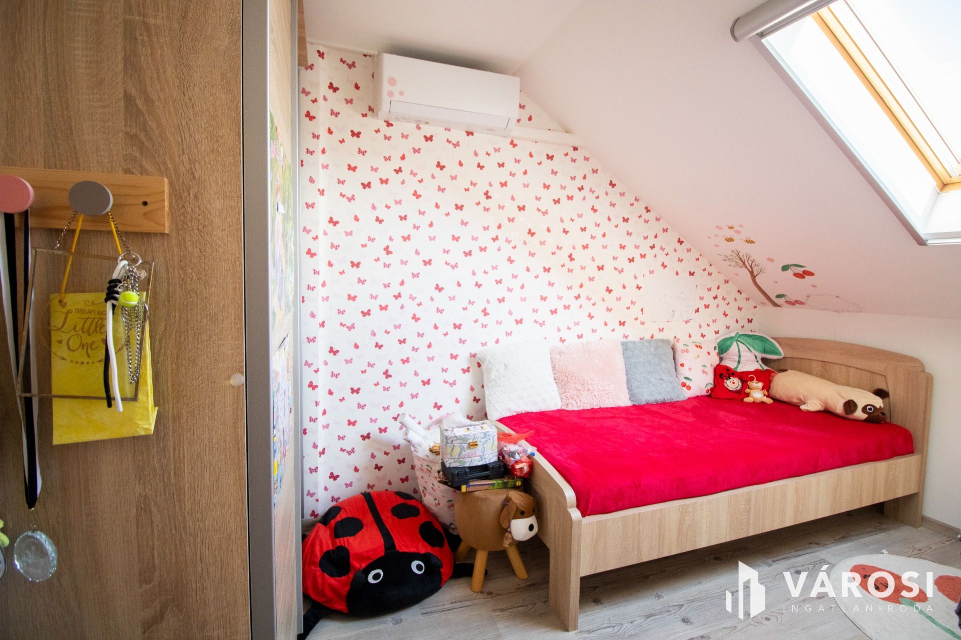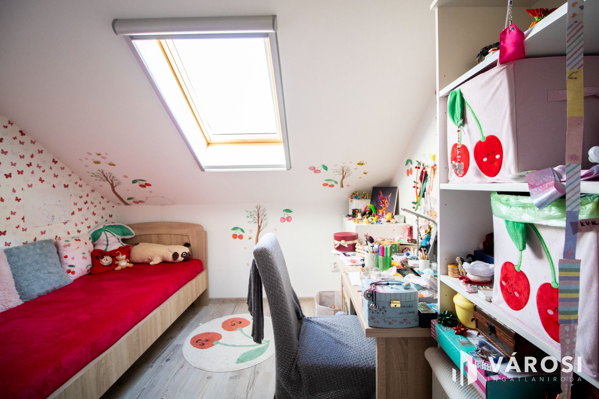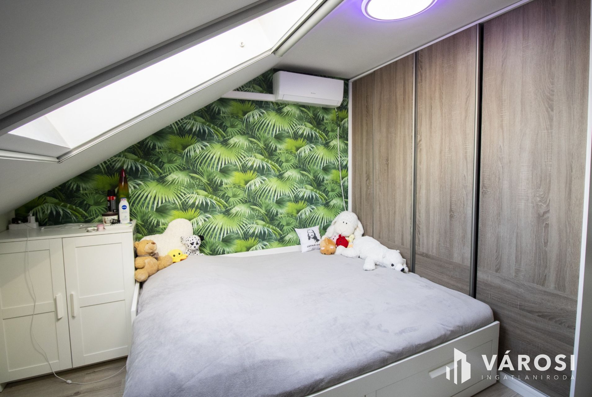 A tetőtérben további két teljes értékű hálószoba található, valamint egy ízléses, épített zuhanyzós gyönyörű fürdőszoba és egy gardrób.