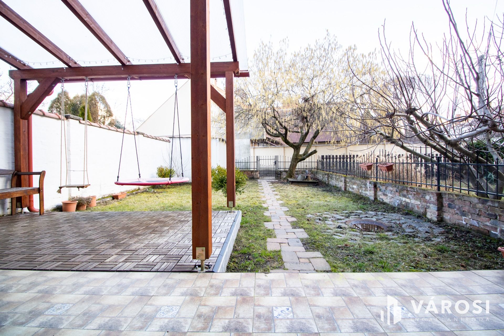A 120 m²-es lakótérhez két külön kert tartozik. Elöl egy kisebb, virágos előkert futórózsákkal fogad, hátul pedig egy teljesen elszeparált, pihenőkert található hangulatos terasszal. Nem túl nagy, de éppen akkora, hogy élvezhető legyen. A kert végében egy praktikus szerszámos tároló is helyet kapott.