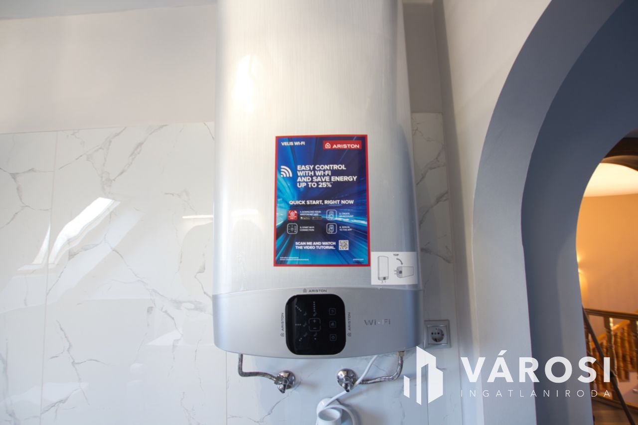 Melegvíz: 300 liter kuffertartály, valamint az emeleti fürdőszobákban plusz Ariston wifis bojlerek.