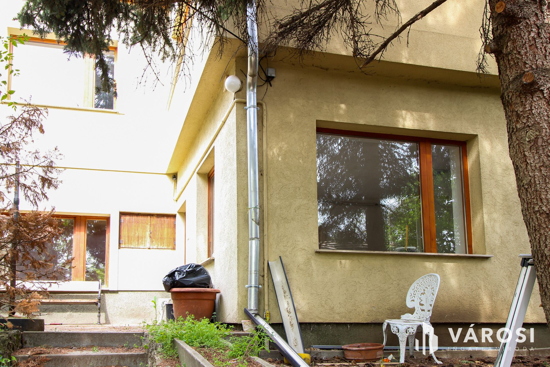 Az ingatlan egy 2114 m2-es telken helyezkedik távol (kb 100 m ) az utcafronttól ,így a kert rész az épület előtt található .