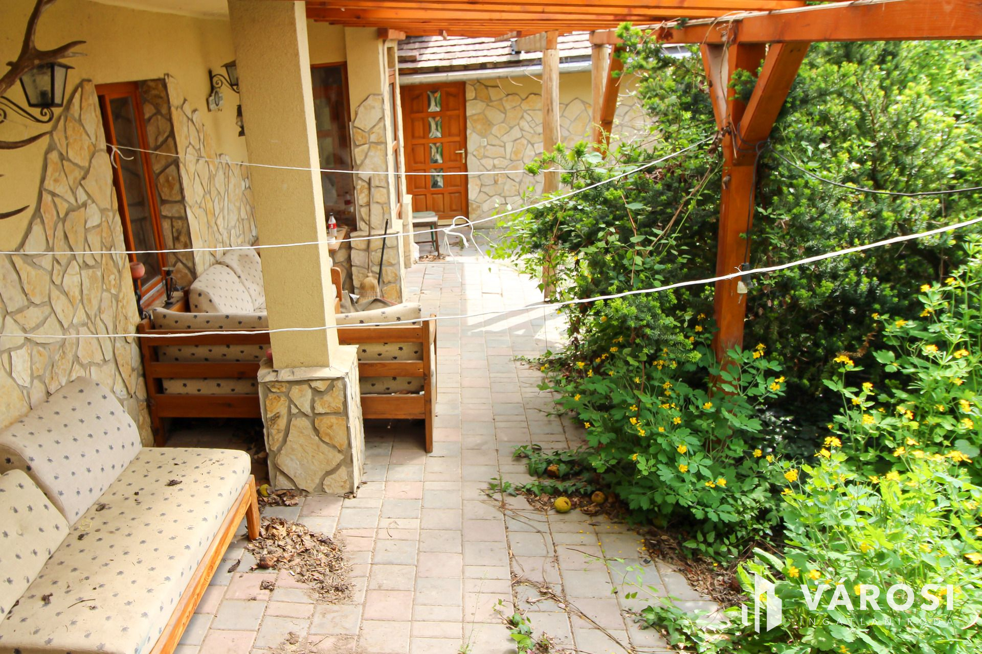 Az igazán egyedi hangulatú kialakítással rendelkező családi otthon, átlagos állapotú, kényelmes terek és kellemes, nyugodt környezet jellemzi. A nagy méretű telken egy gépkocsi tárolására alkalmas zárt garázs , illetve két gépkocsi beállására alkalmas fedett garázs, továbbá egy pince, ásott kút, és egy melléképület helyezkedik.