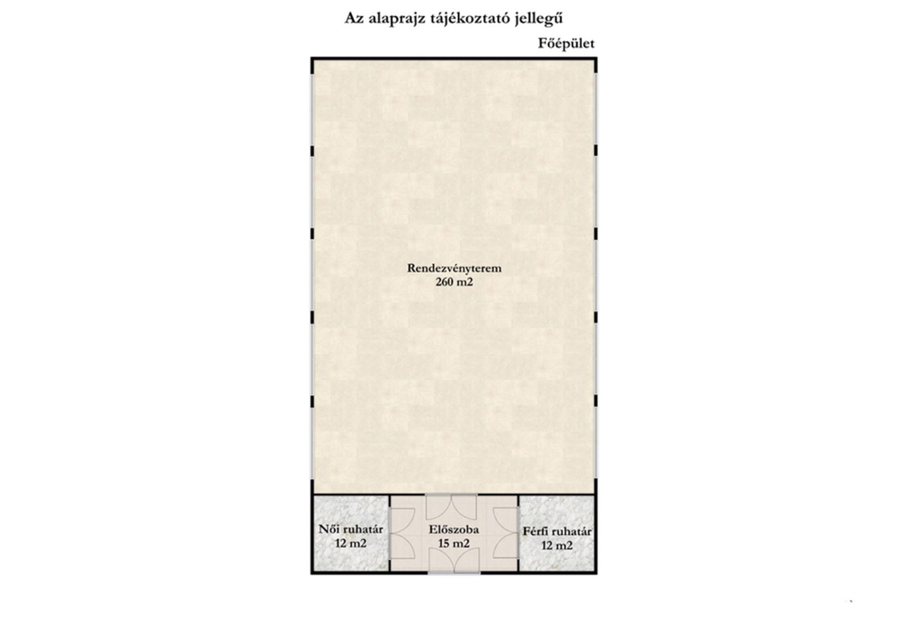 A 300 m² alapterületű, impozáns főépület 260 fő befogadására alkalmas,