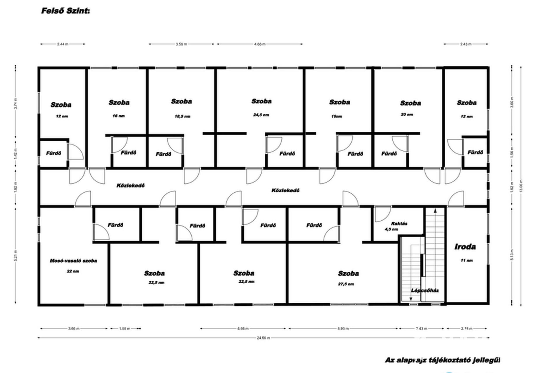 Felső szint: közlekedő, iroda, 8 külön bejáratú szoba saját vizesblokkal, háztartási helység, szolgálati helység. Az ingatlan környezete parkosított, gépkocsival körbejárjató. A vendégek részére térkőburkolattal ellátott parklók állnak rendelkezésre. Az ingatlanhoz tartozik még egy külön telek is ami az épület közvetlen szomszédságában található így bármikor van lehetőség a