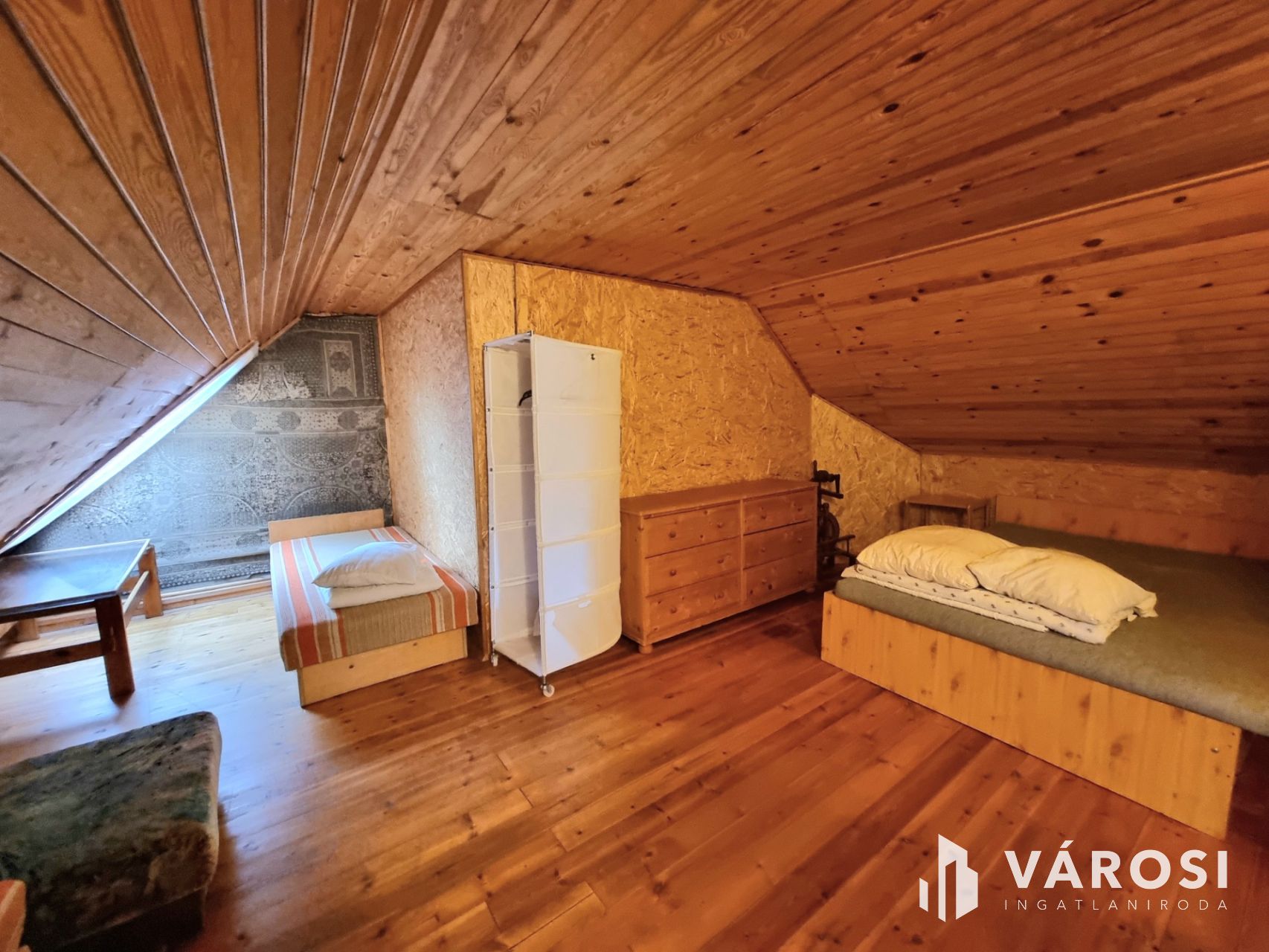 A "felsőház", amely 100m2 alapterületű és jelenleg két apartmanra van osztva. Szoba, konyha, fürdőszoba, mindkettő önálló terasszal. Valamint egy teraszról nyíló, közös háztartási helyiség tartozik mindkét lakáshoz.