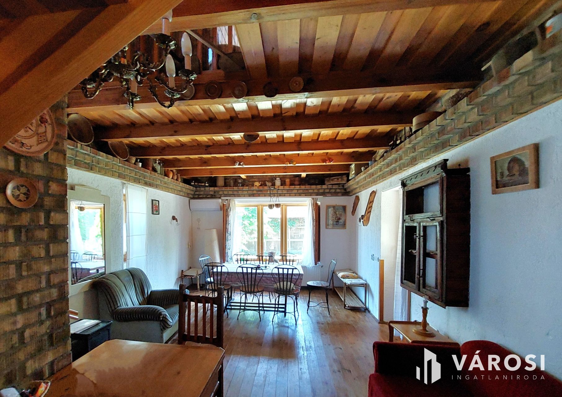 A földszinten 35m2 toszkán stílusban megálmodott nappali-konyha-étkező, tágas fürdőszoba és recepció található. A konyhasarok színes, mázas csempével kirakott, vidám, hangulatos éke az egész lakásnak. Telis-tele a ház éveken át gyűjtögetett régiségekkel, antik tárgyakkal. Ha szeretnék ezt az elbűvölő ingatlant teljes berendezéssel megvásárolni, mángorlóval, szakajtóval együtt, az külön megegyezés tárgyát képezi...